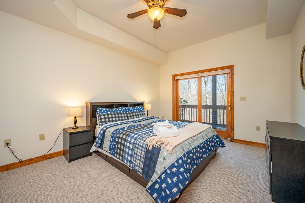 - Bedroom (Suite): King Bed, Deck Access, Attached Bath with Shower and Separate Tub
