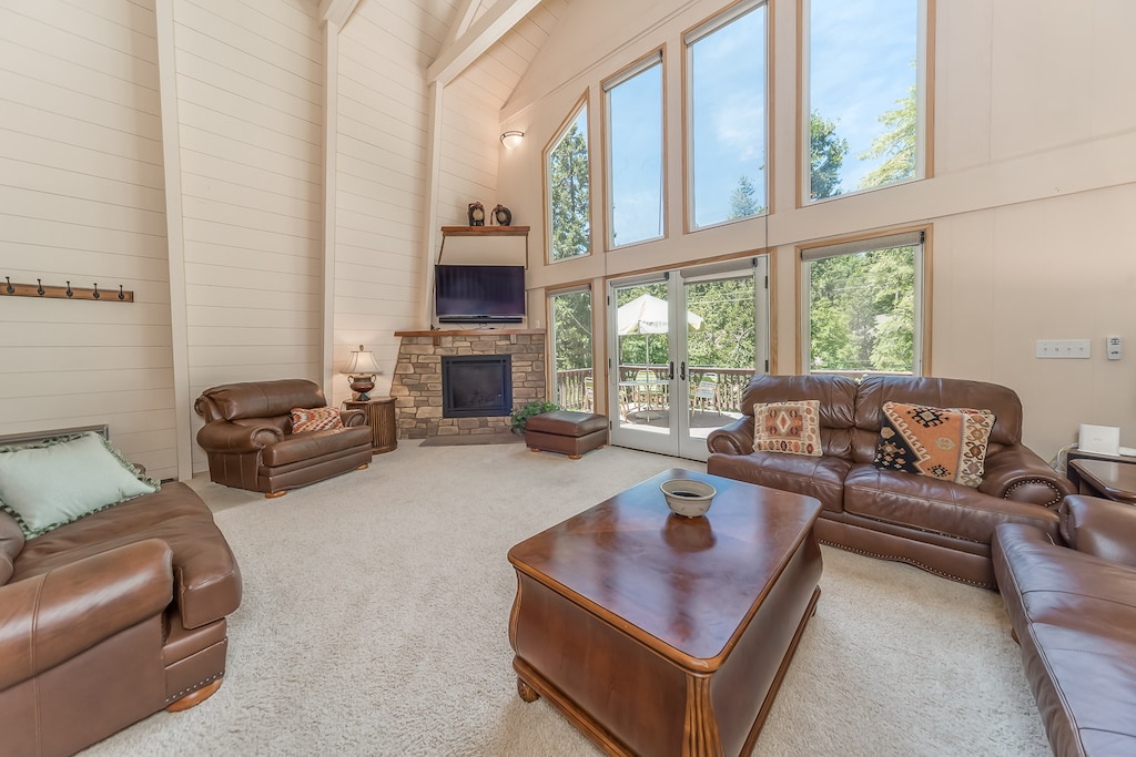 Lazy Bear Lair accommodates 10 guests in 4 bedrooms plus the loft: The first bedroom is located on the main floor and features a King bed. The second bedroom is upstairs off of the loft and features a Queen bed and a Double bed. The loft has a Twin bed (and a foosball table)! The third bedroom is located downstairs with 2 Twin beds and the fourth bedroom is also downstairs with a King bed. This cabin features 2 full bathrooms and a laundry room.