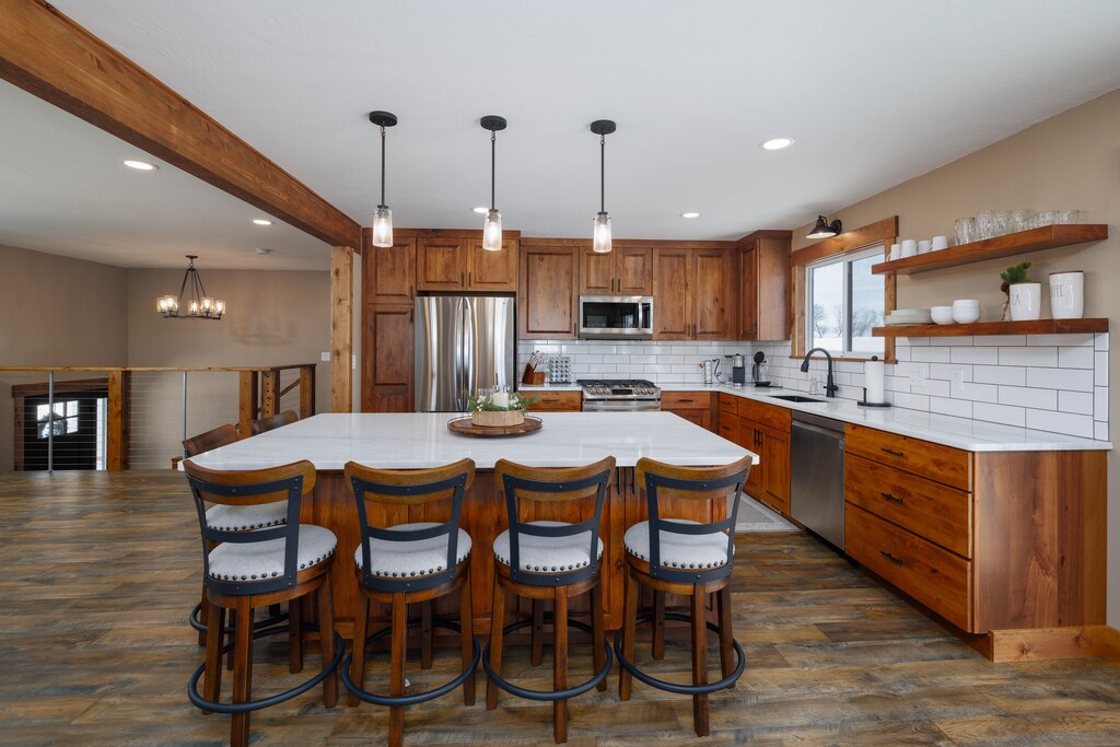Mountain View Delight offers 4 bedrooms, 2.5 bathrooms, two separate living spaces and a gorgeous kitchen, you’ll have enough space for game night, movie night, and everything in between! The bedrooms offer luxurious bedding for the ultimate comfort, and the bathrooms provide lots of space for everyone. On almost two acres, you will have plenty of parking in the driveway or the 2-car garage.