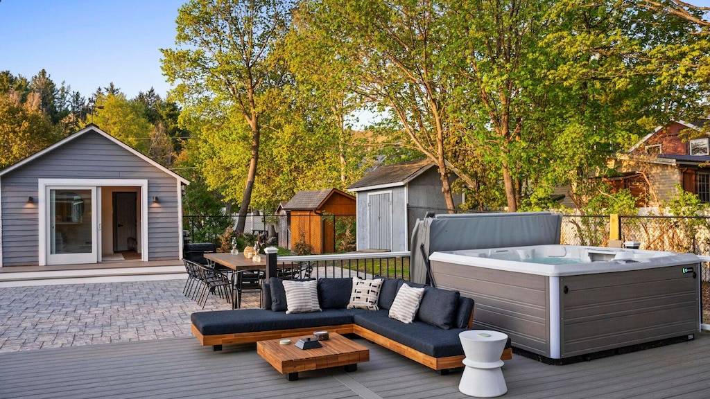 Deck/Patio (Uncovered), Lounge Chairs, Patio Furniture (Table, Chairs, Umbrella), Grill (Gas), Fire Pit (Gas), Fence Around The Yard, Private Pool (Outdoor), Hot Tub