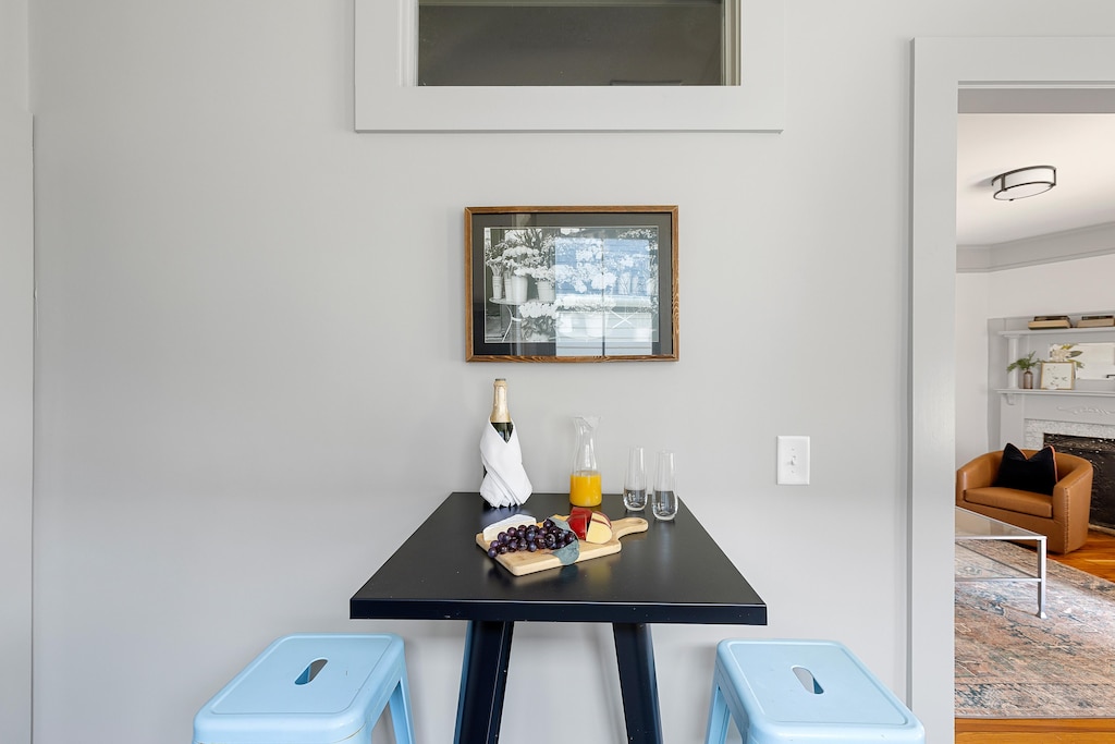 Off the piazza, you’ll find the first bedroom, complete with a king sized bed, a striking original fireplace, and a romantic ensuite bathroom featuring a timeless clawfoot tub. As you move through the home, you’ll pass a charming butler’s pantry and coffee bar en route to the second ensuite bedroom, which offers a queen size bed, another beautifully preserved fireplace with detailed tile work, and a walk-in shower in it’s private bath.