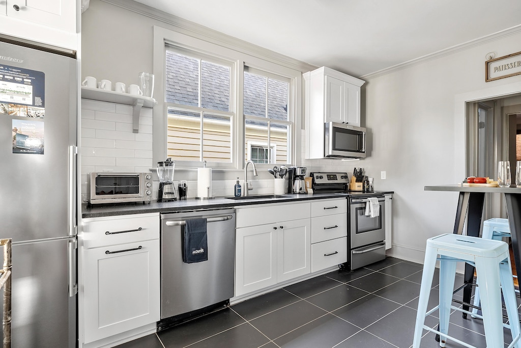 Step into a cozy living area featuring plush seating for five and a large flat-screen TV, perfect for relaxing after a day exploring the city. Just beyond the living room, a fully equipped kitchen awaits with stainless steel appliances, a spacious farmhouse sink, and everything you need to whip up breakfast or a gourmet dinner. Enjoy your coffee at the high-top table for two or dine al fresco on the private piazza, where a classic diner-style table seats six, with additional high-top seating nearby - perfect for Charleston’s mild evenings.