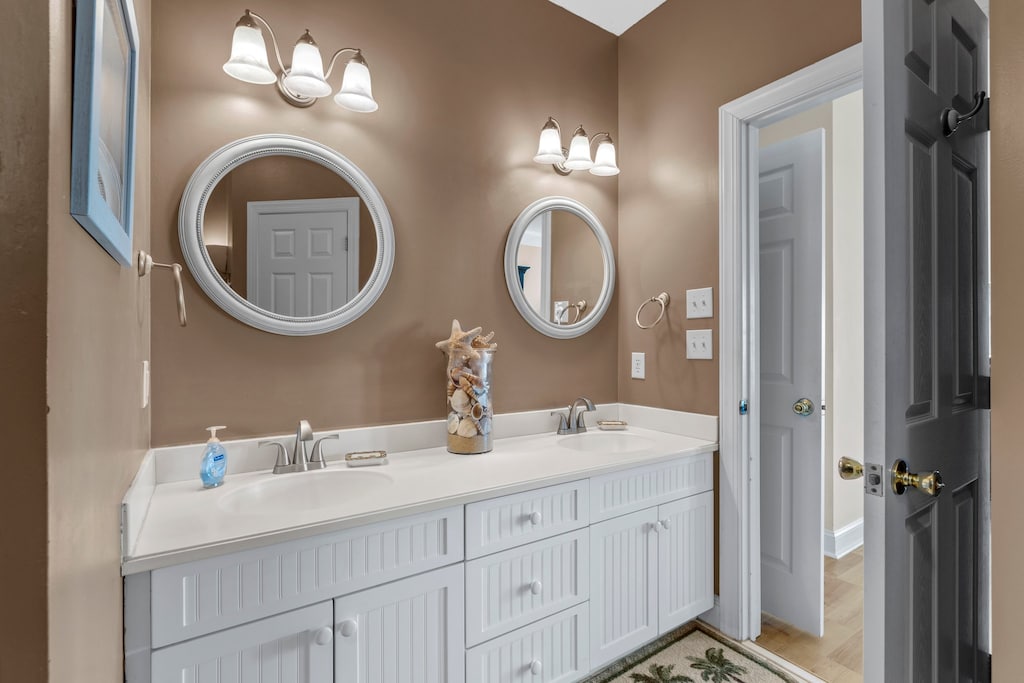 The living area is positioned on the 2nd floor, and what a view there is as soon as you step into the space! The open concept great room is anchored with a large dining table and offers two different lounging area for those not in the kitchen working away! The accommodating kitchen has an under counter ice maker, 2 dishwashers, and all of the usual cookware needed to host a large group for a week at the beach. The second refrigerator located in the garage helps with grocery overflow. Also located on this level are three guest rooms. The oceanfront guest room offers a King bed with a connected bathroom. The bathroom also connects to another guest room with an accommodating Queen bed. Towards the street side of the home you will find a private guest room offering a Queen bed and bathroom.