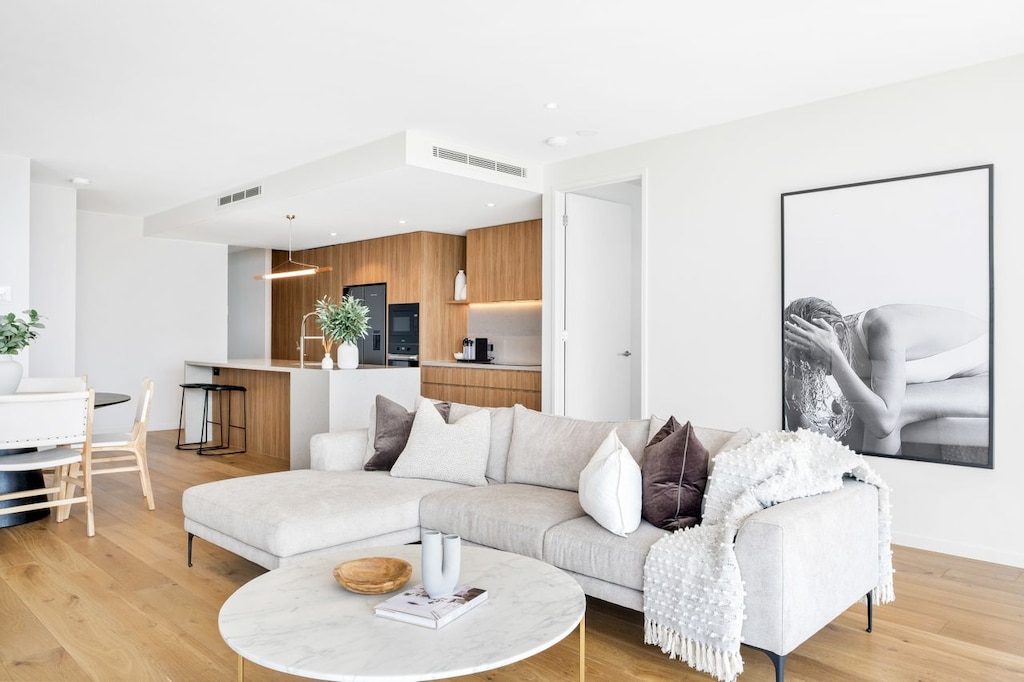 The spacious open-plan area boasts floor-to-ceiling glazing expanding the entire length of the living room, providing uninterrupted views of the ocean, while guests can step straight out to a private covered deck perfect for the afternoon sundowner. Tastefully decorated in neutral colours and comfy furnishings, the lounge is ideal for gathering with family, playing board games, or catching up on the smart TV. The fully equipped, luxury gallery-style kitchen with Miele appliances includes a beautiful stone benchtop breakfast bar and pantry with amenities including: