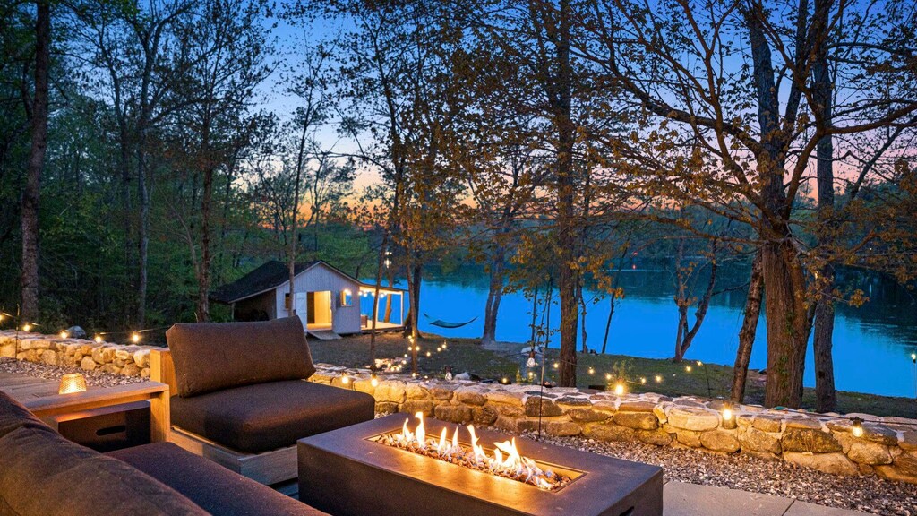 Private waterfront retreat with sandy beach, 1 paddle board, wood and gas outdoor fire pits, gas indoor fire place, hot tub, outdoor shower, steam shower, blue stone patio with grill, umbrella, 12 person table, and abundance of seating options.