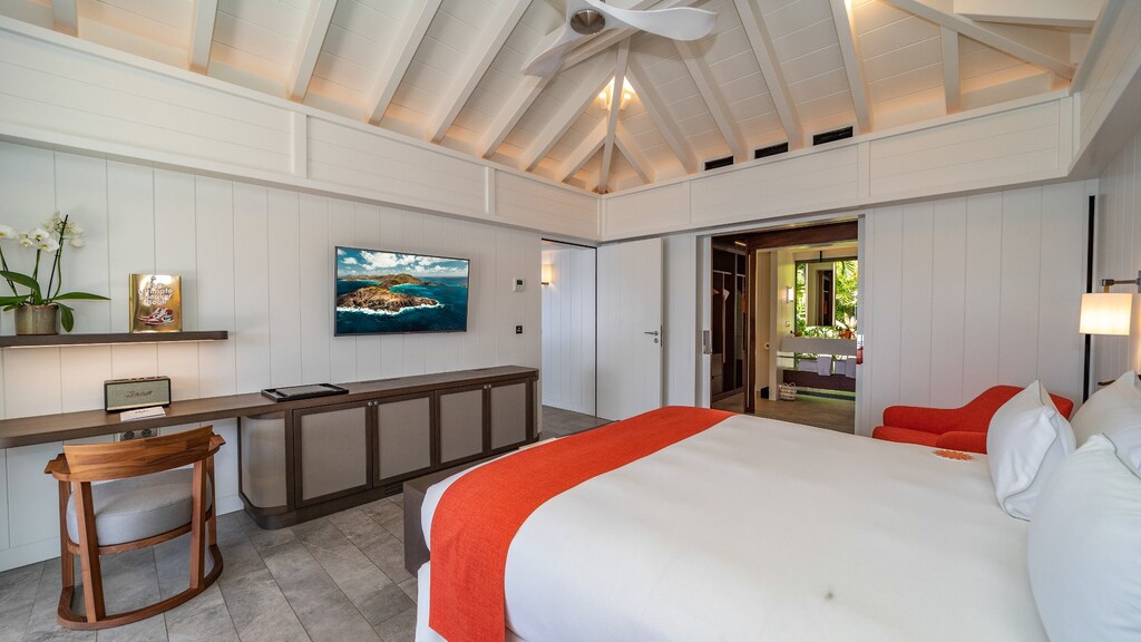 At the front of villa, the terrace features a beautiful heated infinity swimming pool seeming to melt into the sparkling waters of St-Barth. On the wooden deck, loungers are set up under large umbrellas for pleasant moments of relaxation in front of the amazing view. Between the green hills and the deep blue ocean, the scenery is idyllic, dreamy and wonderful. In addition, in the evening, you will marvel at the fabulous spectacle of sunsets over the ocean, making your stay in St. Barths a true moment out of time.