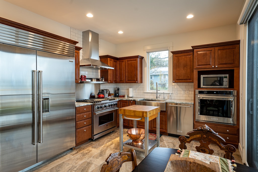 On the middle floor, you will enter a spacious living room, open to the dining area, and a beautifully appointed kitchen where you will find a butcher block floating island and top-of-the-line appliances, including a Sub-Zero extra-wide refrigerator, dual-heat Viking oven, convection oven, and vented hood. All of this with a view of Lake Michigan and Grand Haven State Beach!