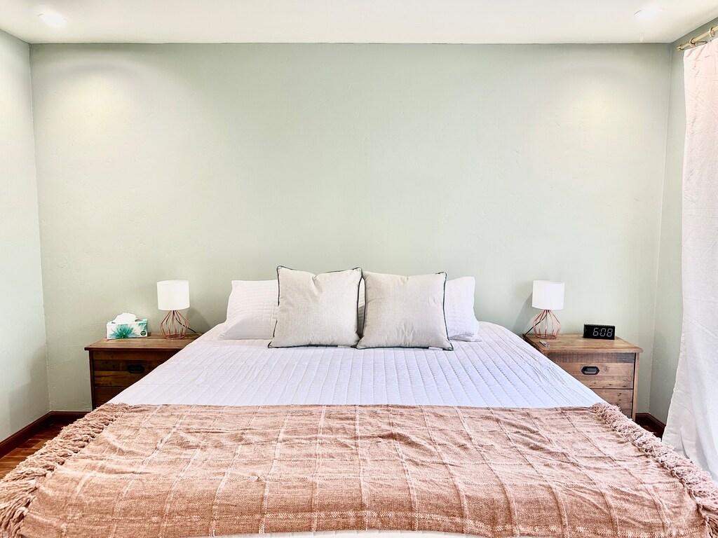 Master Bedroom: Queen Bed with ensuite bathroom, walk in closet, and backyard access.