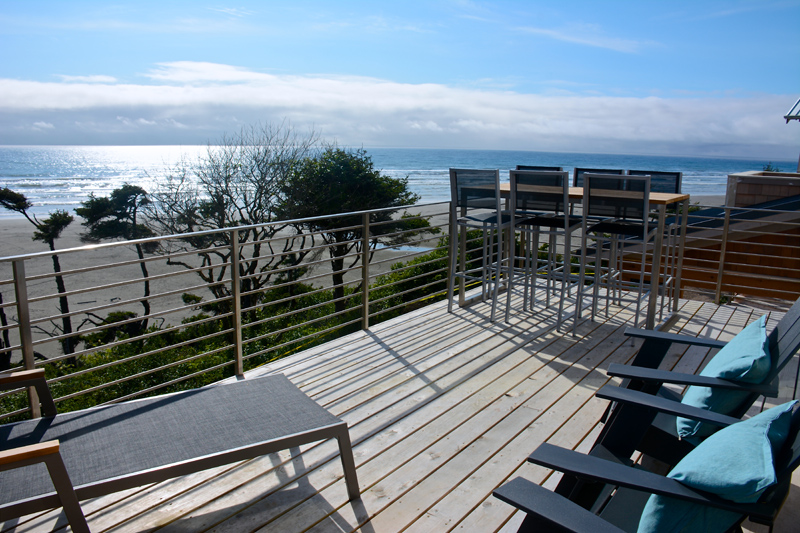 There are two outdoor spaces on the ground level. The entry courtyard is private, with a hot tub, DCS BBQ, bistro table and chairs. The main porch overlooking the ocean is a jewel! Its comfy chairs and gas firepit/table, make sunset watching and ocean gazing a year round treat. A teak table and chairs seats 6-8.