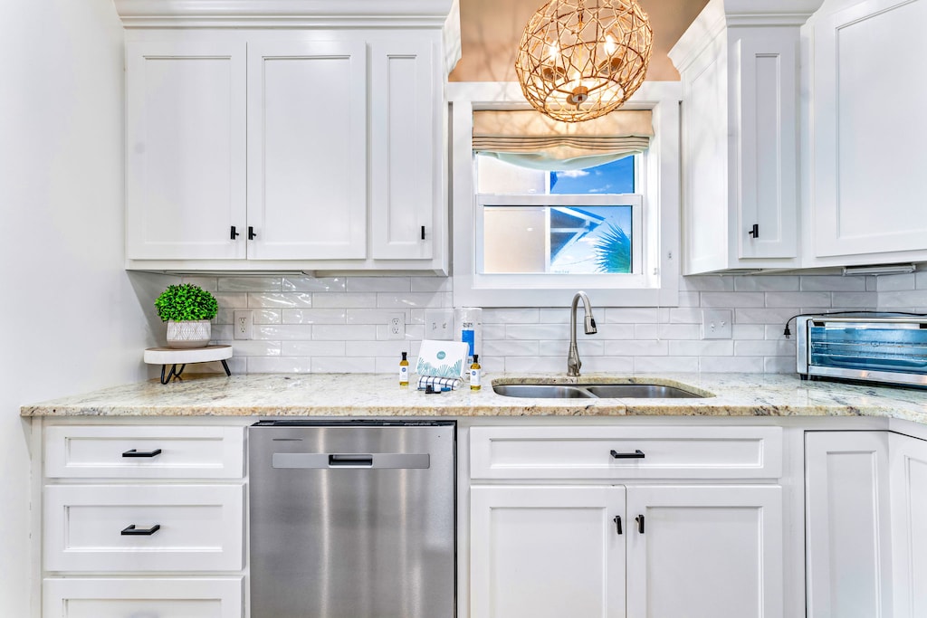 Reel Chill vibes set the tone for guests who enter this exquisite 3-story home, with modern light fixtures, seaside-inspired art, and shiplap ceilings. The open-concept layout maximizes each space of the first-floor great room as wall-to-wall windows invite guests in for astounding waterfront views. The classically designed kitchen features granite countertops, an ornate backsplash, and a kitchen island surrounded by white cabinets. A wood table with 10 slat-back chairs ensures friends and family have a place to gather for dinner, while the eye-catching living area provides a comfortable couch, 2 armchairs, and 2 rattan chairs to unwind on. Through the French doors is a Gulf-facing deck, perfect for grilling out and dining alfresco. There is 1 king guest bedroom on this floor for added convenience.