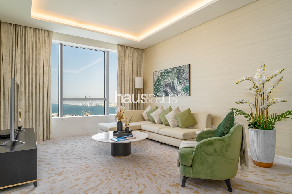 This luxurious holiday home, located on a high floor, will never fail to captivate you with its outstanding panoramic Palm and Arabian sea view. Palm Tower also has luxury amenities such as an infinity deck pool, a multifunctional podium, a viewing deck, and leisure areas.