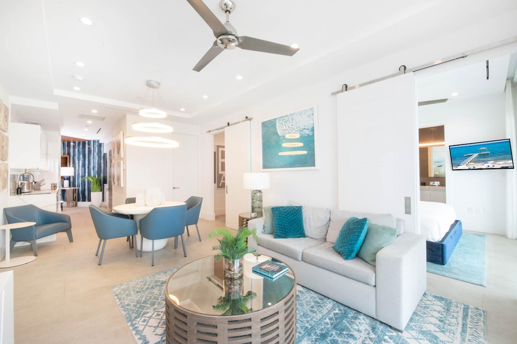 All Rum Point Resort condos feature sleek finishes, designer decor, and an open-concept layout maximizing space, natural light, and stunning ocean views. All the comforts of home are included in this 1-bedroom + den condo, totaling 1,250 sq. ft., including gourmet kitchen appliances, quartz countertops, SmartTVs for streaming, and a private oceanfront balcony.