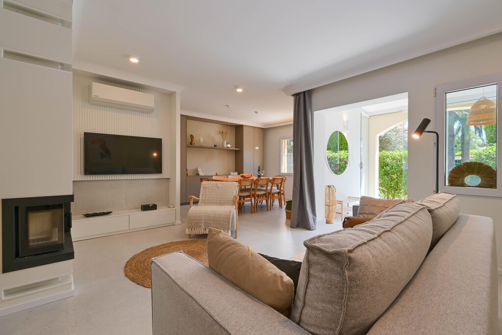 The apartment has 3 bedrooms and 3 bathrooms, spread over 3 levels. The accommodation offers a lawned communal garden with trees and a view of the pool. Its comfort and the vicinity of the beach, places to shop, sports activities, entertainment facilities, places to go out, sights and culture make this an ideal apartment to spend your holidays in Spain with family or friends. Interior of the apartment3 level apartmentair conditioned living room with television and sofabed (sleeping option for 2 people)dining roomfireplace in living room (wood)Terraces at 1st and 2nd floor with coffee table and two chairsglass separated porch with a sofa3 bedrooms and 3 bathroomscable televisionThe main floor is only accessible from the outside. Kitchenopen kitchen with electric hob, electric oven, microwave, dishwasher, refrigerator-freezer, coffee machine, electric kettle, mixer, toaster and juicerBedrooms and bathroomsair-conditioned bedroom with single bed (measuring 200 by 90cm) and bunk bed (measuring 200 by 90cm)air-conditioned bedroom with double bed, television and bathroom en-suiteair-conditioned bedroom with double beden-suite bathroom with single washbasin, bath/shower combination and toiletbathroom with double washbasin, shower and toiletbathroom with single washbasin, shower and toiletExterior of the apartmentlagoon shaped communal pool measuring 40m x 30m and 2m deepchildren's poollawned communal garden with trees2 covered terracesoutdoor showeroutside sitting area and outside dining areaMore informationnearest town: Javea (within 3 kilometers of the apartment)nearest riverbank or shore: Mediterráneo (within 1000 meters of the apartment)nearest beach: El Arenal, Javea (within 1000 meters of the apartment)nearest port: La Fontana, Javea (within 500 meters of the apartment)nearest park: Montgo, Javea (within 1000 meters of the apartment)nearest airport: Alicante (within 100 kilometers of the apartment)second nearest airport: Valencia (> 100 kilometers)smoking not allowedplease consult if pets are allowedThe accommodation is very suitable for families with childrenFacilities and services included in the rental price of the apartmentinternet (fibre 500Mb)iron and ironing boardbed linen and towelsreception service and 24 hours emergency serviceair heating and air-conditionedFacilities and services at extra chargeairport serviceextra bed and children bed/cot (on demand)Entertainment and leisure activities for your holidays in Javea, Costa Blancabar (within 500 meters of the house)discotheque, promenade (El Arenal and Javea) (within 1000 meters of the house)cinema (within 5 kilometers of the house)Sights and culture in Javea, Costa Blancamuseum (Historico de Javea), church (Virgen del Loreto), monument (Pueblo de Javea), architectural building (Historico de Javea) and historic place (Pueblo de Javea) (within 5 kilometers from the accommodation)ruin (Molinos del Viento and Javea) (within 10 kilometers from the accommodation)castle (Portal de la Villa and Denia) (within 25 kilometers from the accommodation from the accommodation)Sportstennis, diving, snorkeling and surfing (within 1000 meters of the apartment)hiking, mountainbiking, cycling, climbing, canoeing, kayaking, fishing, waterskiing and windsurfing (within 5 kilometers of the apartment)golf (Club de Golf, Javea) and horse riding (within 10 kilometers of the apartment)