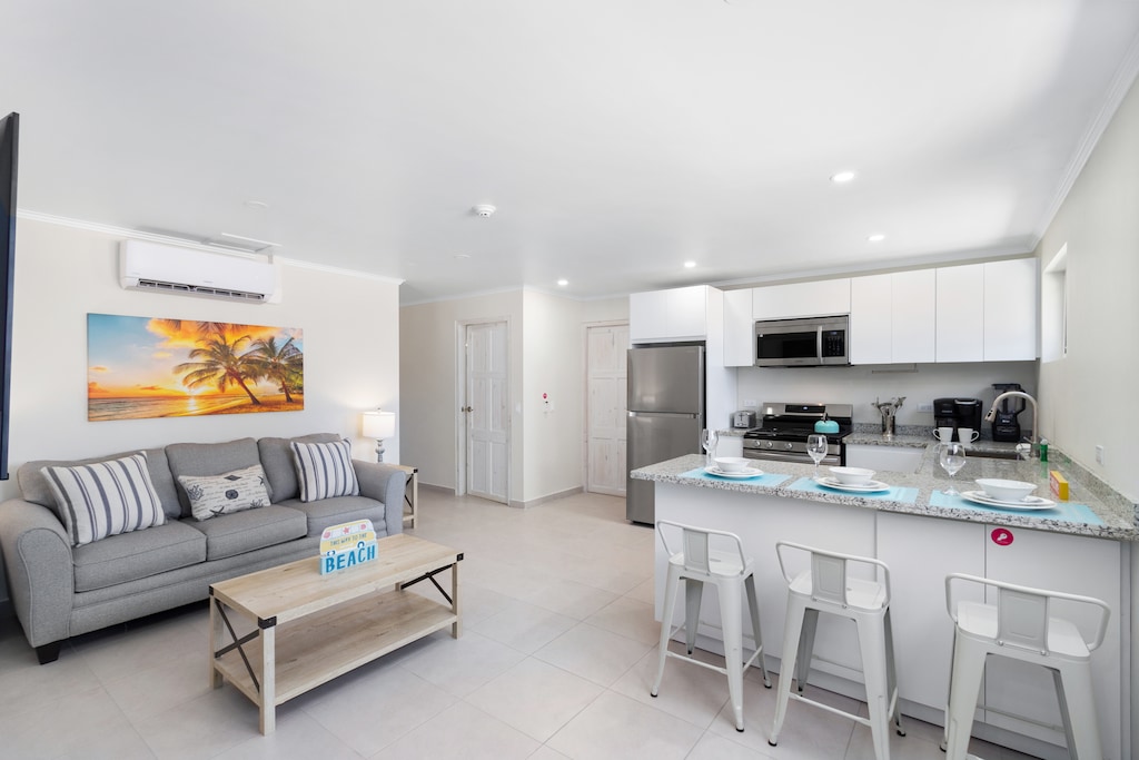 This inviting condo offers a fully equipped kitchen, ensuring you have everything you need to prepare delicious meals. The spacious living room provides a comfortable area to relax after a day of exploring the island.