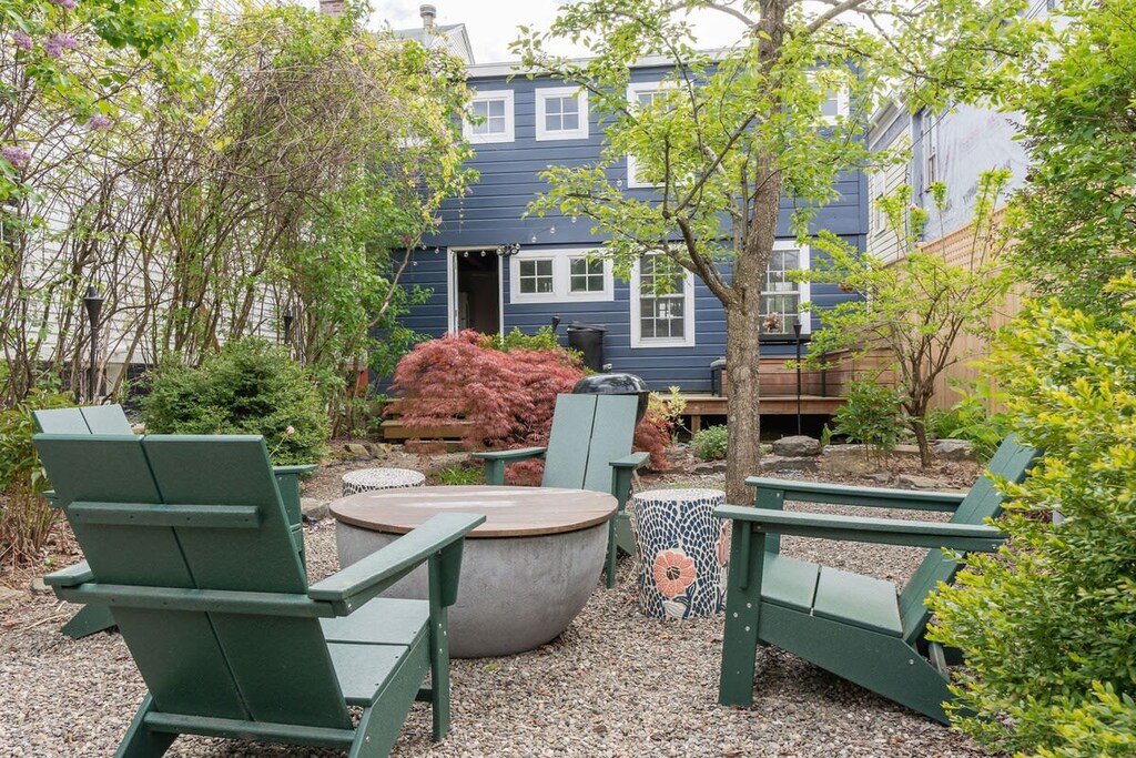 This is a bright and airy open plan house flowing seamlessly between the first floor two-way gas fireplace and the loft upstairs. The private bedroom sleeps two and is a calm oasis looking over landscaped backyard. Upstairs open loft area sleeps two on a sleeper sofa. Bathroom is large, with rain-shower featuring beautiful glass tile, custom concrete poured sink, clawfoot tub, and heated towel rack. Backyard opens onto deck, landscaped garden, and Warren Street through private gate. for easy access and includes fenced-in parking for your car. Kitchen has basics (utensils, plates, etc.) with butcher-block counter tops for all you chefs (although we are not chefs, so please ask if you are expecting a specific tool), dishwasher, and great view over the backyard. First floor living room is great for sitting by the fire, or reading.