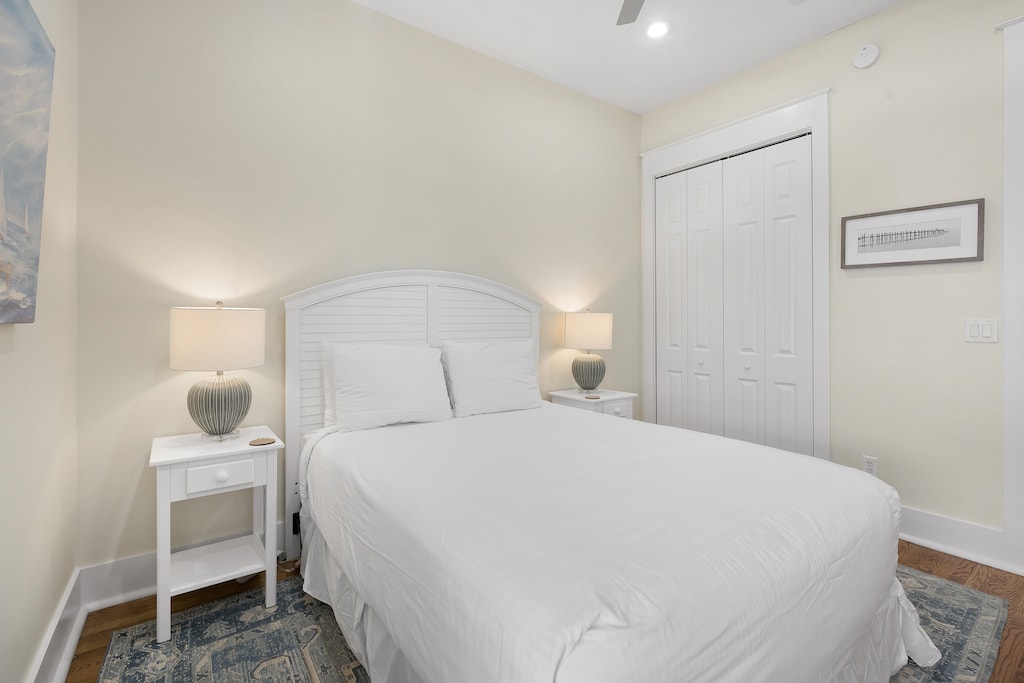 The first primary bedroom, king, has a walk-in closet, and a private bathroom with a large, jetted tub, walk-in shower, and dual vanity. Just beyond the kitchen is the second primary bedroom, queen, with private bath. Down the hall, a kids’ bedroom has a bunk, twin over full, with a pull-out trundle. A foldout bed is also available.