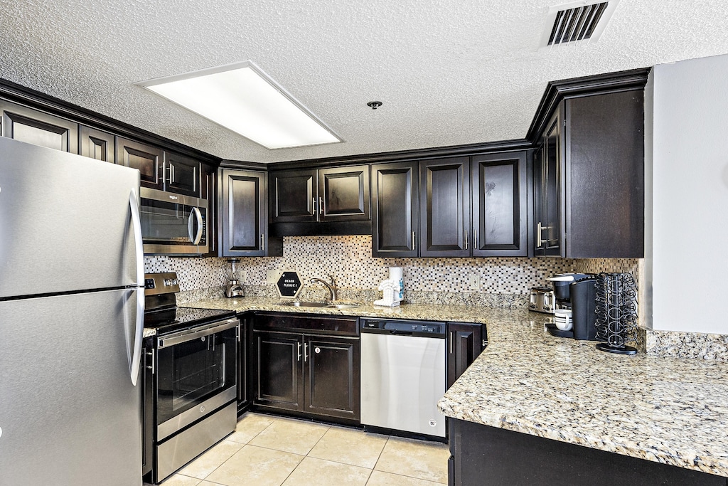 The living area is a haven of comfort, creating an ideal space for relaxation after a day in the sun. Adjacent to the living room is a fully equipped kitchen with top-of-the-line appliances, granite countertops, and ample cabinet space. Whether you’re preparing a gourmet meal or simply enjoying a morning coffee, this kitchen is sure to delight any chef.