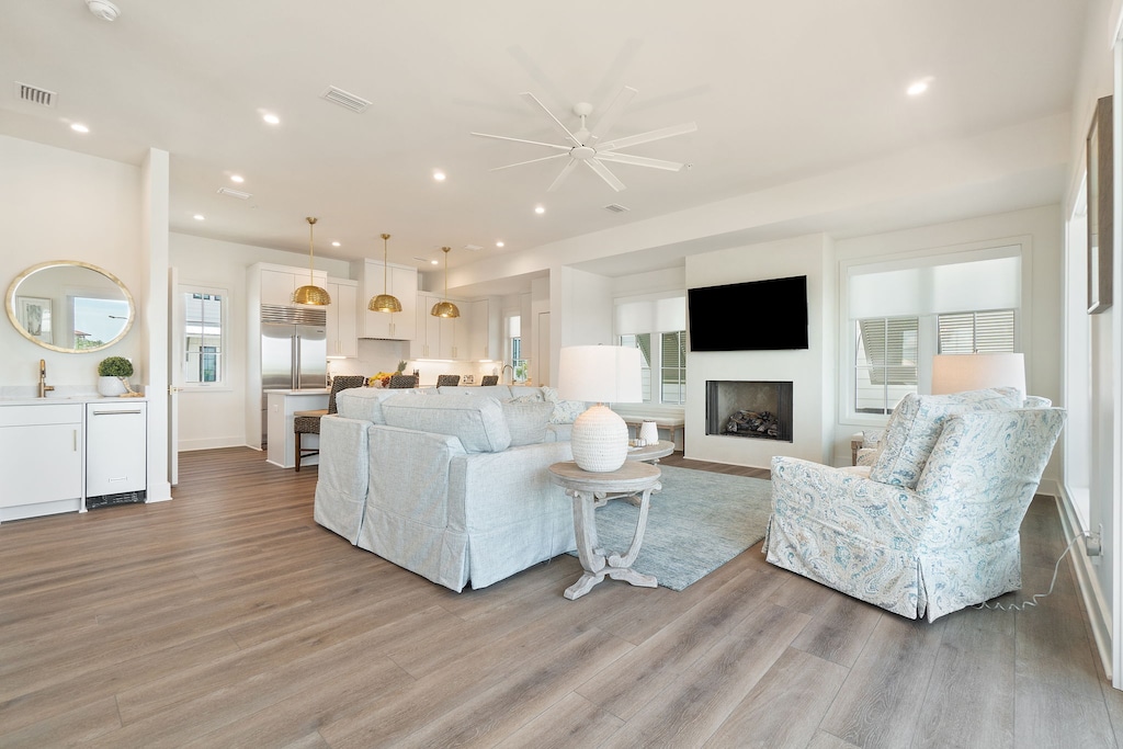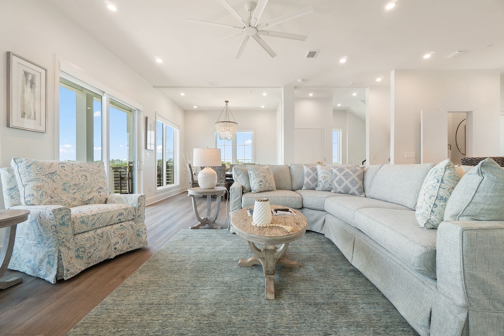 As you step inside, you are greeted by a grand foyer adorned with exquisite coastal-inspired decor. The open concept living area invites you to relax and unwind, with its seamless blend of sophistication and laid-back charm. Floor-to-ceiling windows bathe the space in natural light, illuminating the tastefully appointed interiors.