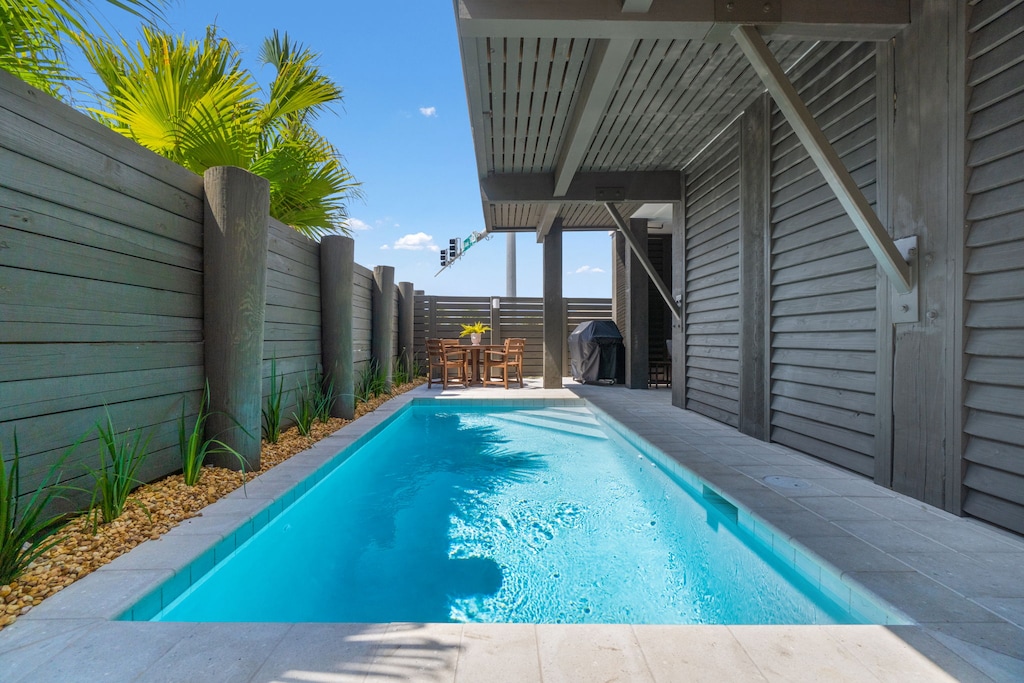 Outside, a private pool beckons, offering a refreshing respite on warm days. Immerse yourself in the crystal-clear waters, bask in the sun on the surrounding deck, or unwind in the shaded lounge area. The poolside patio presents an ideal spot for alfresco dining and entertaining, complete with a gas grill to enhance your outdoor culinary experiences.