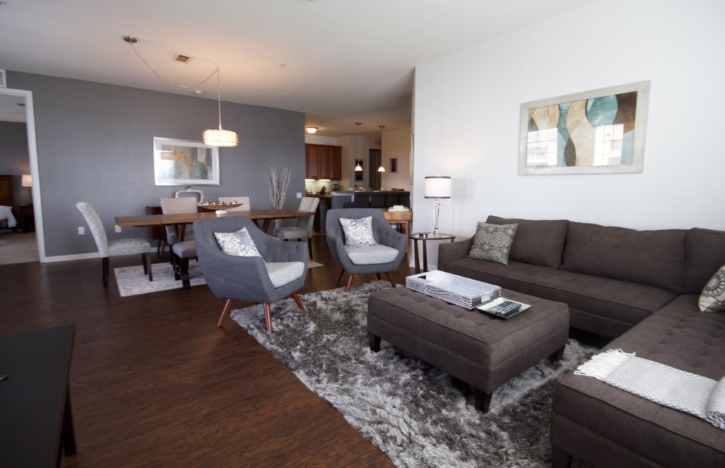 The living room leads out to a large, furnished patio where you can enjoy cool
