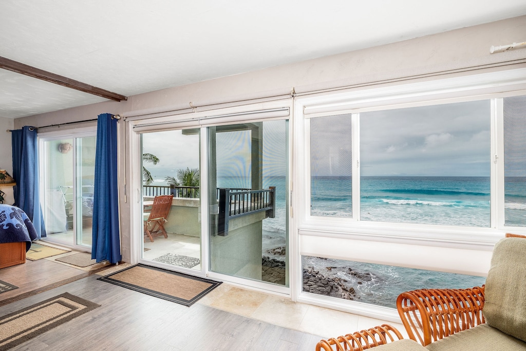 Full length views of the ocean from both the living room and bedroom of this