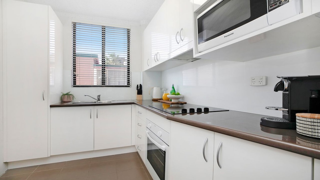 • Fully equipped kitchen with microwave, toaster and sandwich press (note no dishwasher)