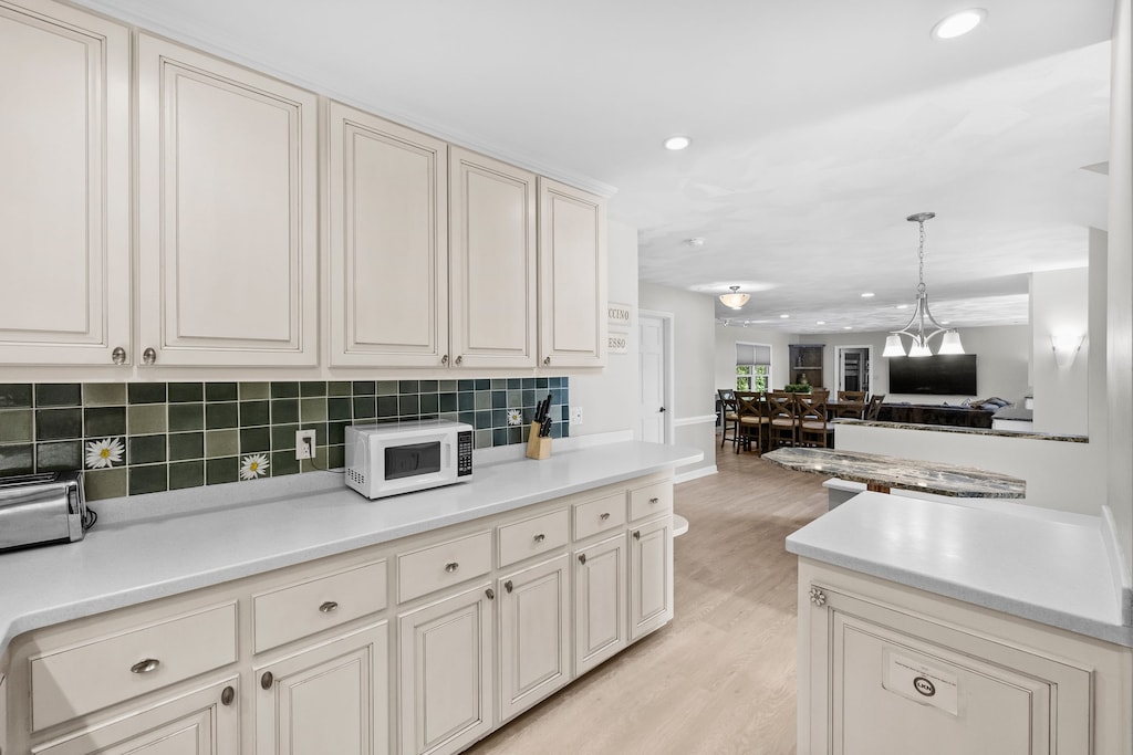 The bright kitchen is fully equipped to handle any occasion, whether it’s an elaborate holiday feast or simply feeding a growing family. Keep the kitchen stocked with all their favorite drinks and snacks because you have all the space you need. The kitchen’s built in table offers the perfect space for your everyday meals, quick snacks, and breakfasts. The adjacent dining room is great for sit-down family style dinners and is elegantly furnished, making it the perfect setting for even the fanciest occasions.