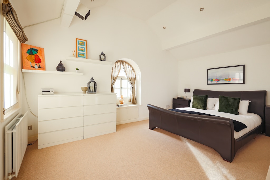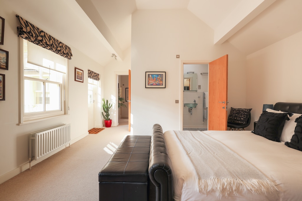 The first double bedroom and a shower room sit on the ground floor looking out through triple glazed sash windows to the internal courtyard garden. Double blinds (in all the bedrooms) allow for weekend lie-ins and the double bed has a deep memory foam mattress dressed in fine cotton linens and plump pillows for ultimate comfort, so whatever time you fall into bed, you can ensure a truly restful night’s sleep. The shower room is spacious and also houses the washing machine – ideal for those staying longer than two-nights. This room is wheelchair accessible, however, please note there is a step up into the shower which is 10 inches high.