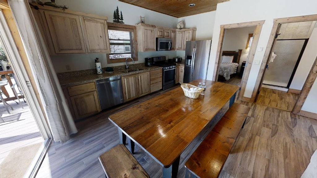 The clean, organized and well stocked kitchen is open to the dining and living room. The kitchen features new appliances and is completely stocked with everything you need to prepare meals including plenty of dishes, silverware, cookware & cooking utensils.