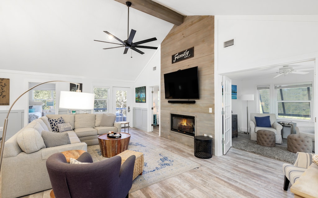 On the second floor, the open living area is highlighted by a spectacular vaulted ceiling. This is another gorgeous and inviting space. The updated kitchen has new countertops, and the large farm table and breakfast bar provide ample seating. Down the hall, a primary bedroom, king, and a guest room, king, each with a private bath and access to a balcony. A guest room, queen, is also on the second floor.
