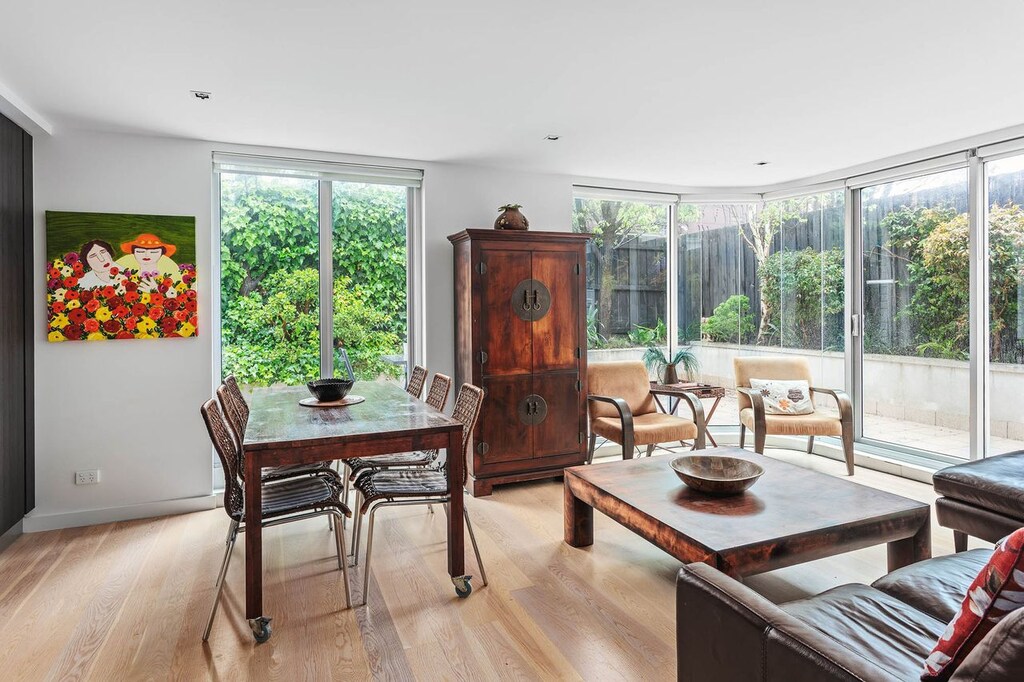 The open plan living area includes a modern kitchen with Miele appliances, dining table and lounge with comfortable sofas to view the generously sized TV. The light-filled living area features floor to ceiling windows, which overlook the spacious private courtyard, complete with outdoor dining and BBQ facilities.