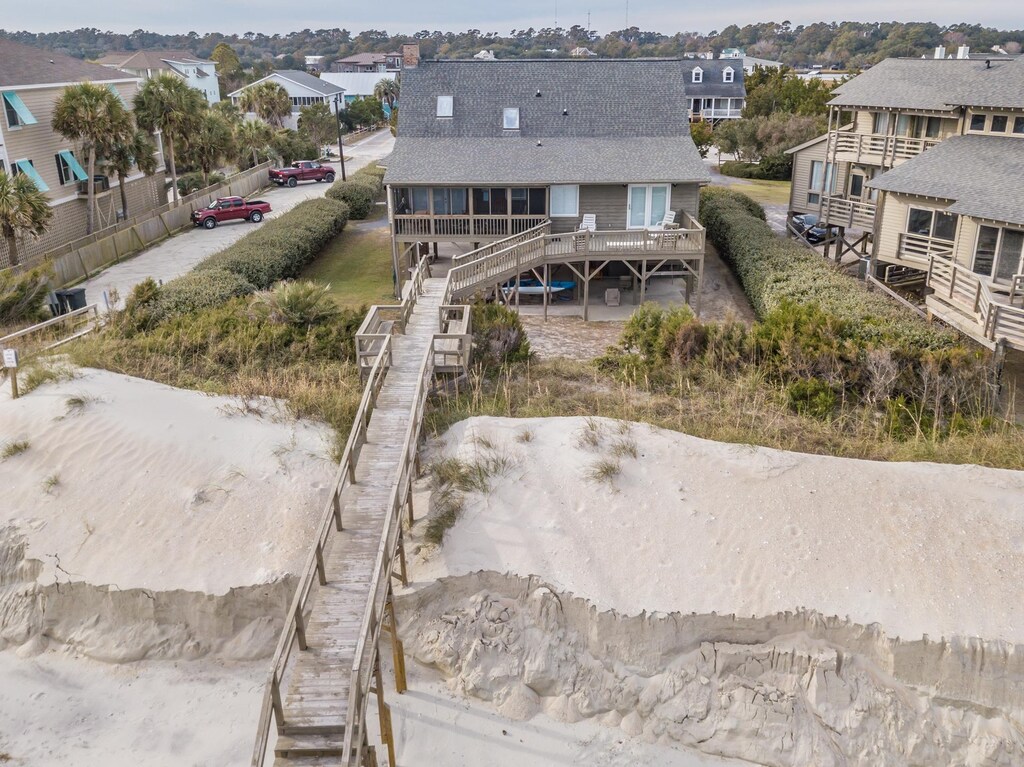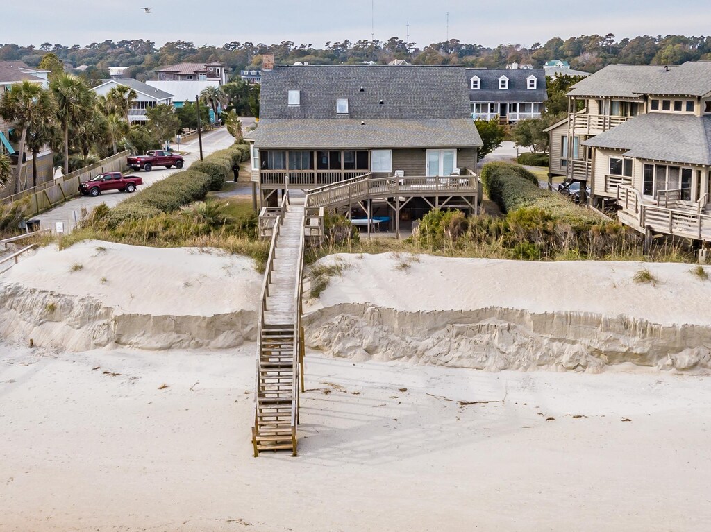This beautiful oceanfront beach house on the North End of Pawleys Island is sure to wow any visitor! The interior, featuring hardwood floors, cathedral ceilings, and an updated and stylish kitchen, allows for a stress-free and comfortable vacation. Enjoy the views from the ocean-side screened porch and the front and back open porches or walk down the private walkway to enjoy the beach hands-on. Outdoor entertainment also abounds here, with access to a surfboard and beach chairs to make your beach stay even more enjoyable. Amenities include wifi, 2 cable TV’s with VCR, microwave, dishwasher, washer/dryer, central H/VAC, and an ice maker