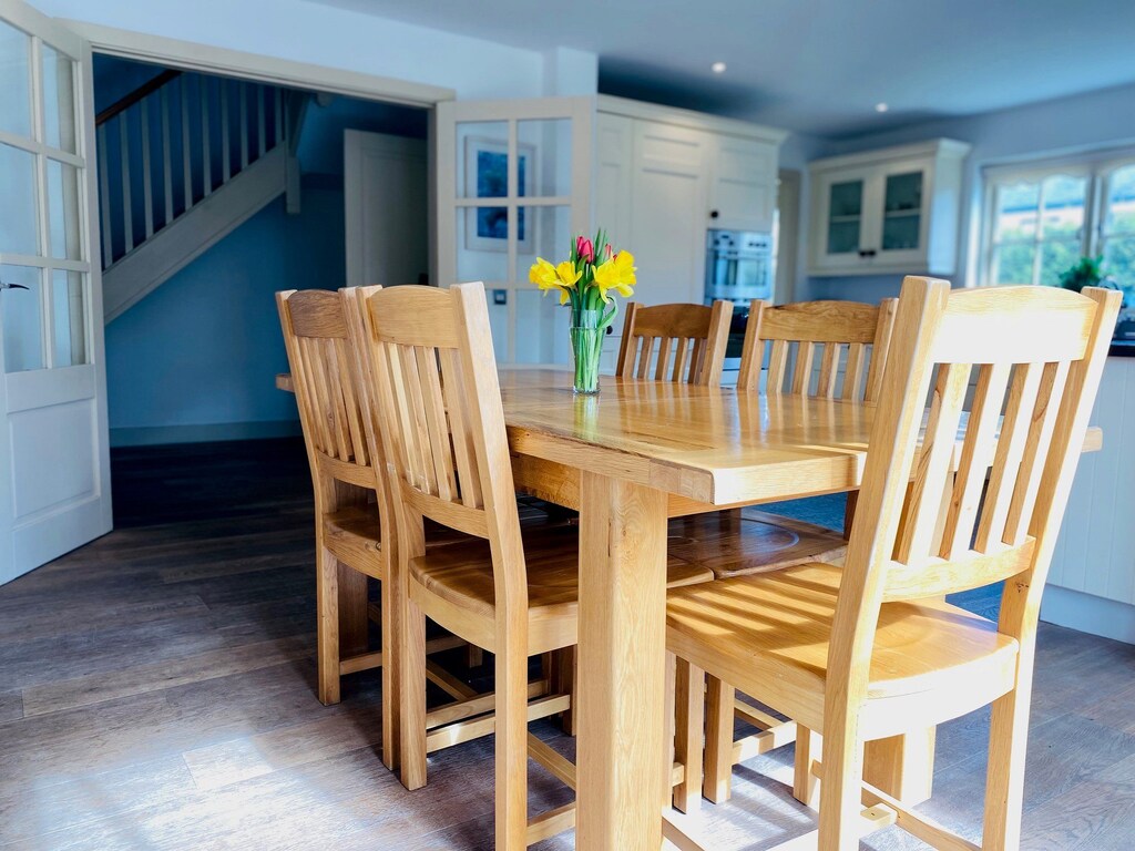 The sitting room is warm and cosy with a wood burning stove and comfy soft leather couch and armchairs. There is a brand new flat screen TV and wifi is available free of charge during your stay.