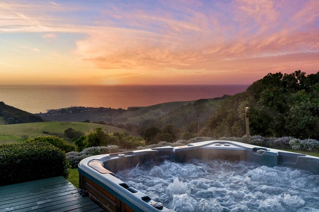 Saddleback Grove is a beautiful country home perched on a hilltop with dramatic rural and coastal views descending beneath it. Suited to the most discerning of guests this stunning property is styled and decorated to an excellent standard and features a spa with a view like no other.
