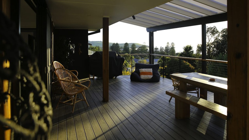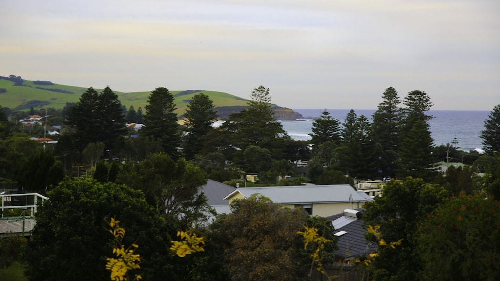 This funky, pet friendly beach house has beautiful bedrooms and generous living spaces including a games area. Headland to headland views and within easy walking distance to the beach and town!