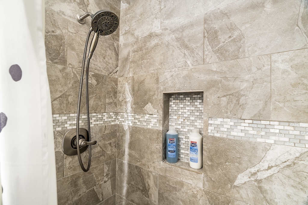 Both bathrooms have incredible walk in showers! The back bedroom is surrounded