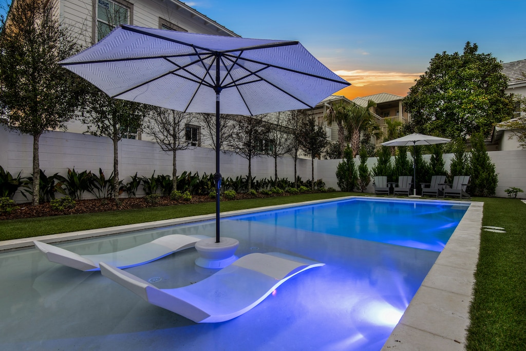 \- Access to the backyard with pool, outdoor dining table, and grill
