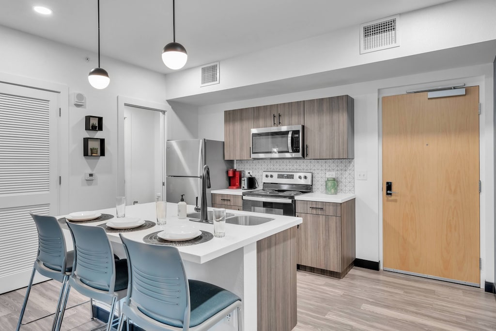 Find the ideal haven to rest & recharge within Apartment 210 -- The Well @ SVB on Live Well Lane in scenic Zephyrhills. This 2 bedroom, 2 bathroom escape offers the refreshing respite for your Florida stay. Located on the second floor, you step into a bright & fun surf-themed living space. The kitchen is ideal for creating a modest or a gourmet meal during your stay. Keeping the continuity with you and your family or guests, the oversized island plays an integral role with seating for 4! When you finally get the downtime after a busy day, enjoy relaxing in the cozy living area with the 50" Roku Smart TV & take time to indulge in that series you’ve been waiting to see! You can stay connected with complimentary Wi-Fi. As the day comes to an end, retire to the inviting bedrooms, each adorned with cozy furnishings and soft linens.