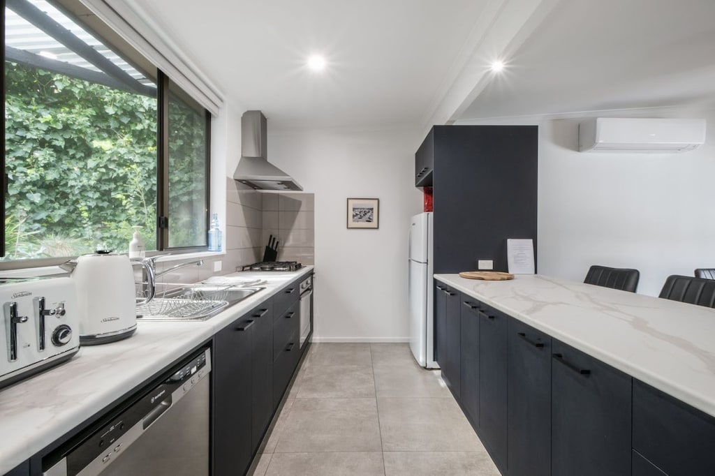 The entrance hall, with the option of a large fold-out sofa bed, has access to a delightful private self-contained Queen bedroom with a small Kitchenette–sink, glassware, cutlery, kettle, toaster, and bar fridge–reverse-cycle air-conditioning, a small television, ensuite–shower, single vanity and toilet–and private entrance through sliding doors beneath the carport.