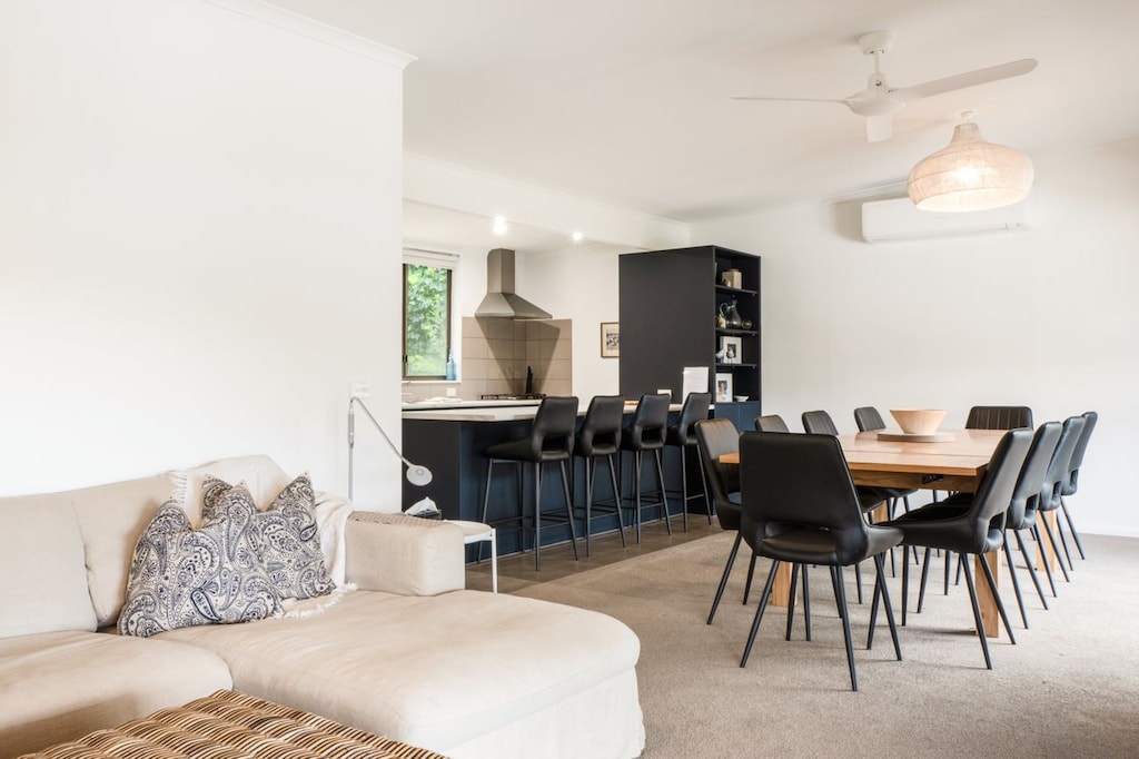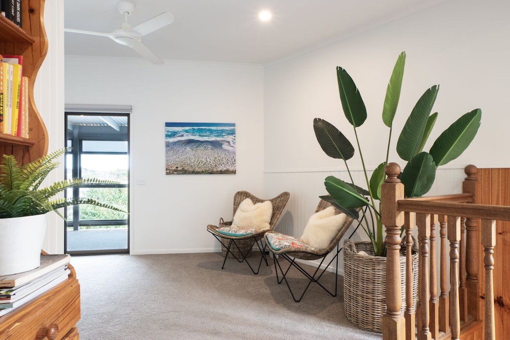 Going upstairs–17 carpeted steps–will take you to a beautiful light filled landing where you’ll find a bedroom with queen bed and ceiling fan. The landing extends into the open-plan living area with comfy reading chairs, lounge with flat-screen TV and ceiling fan, 8 seat dining table, a modern kitchen with enormous breakfast bench, gas cooktop, oven, dishwasher, microwave, fridge and an abundance of cutlery, crockery, glassware, pots and pans, and a coffee plunger.