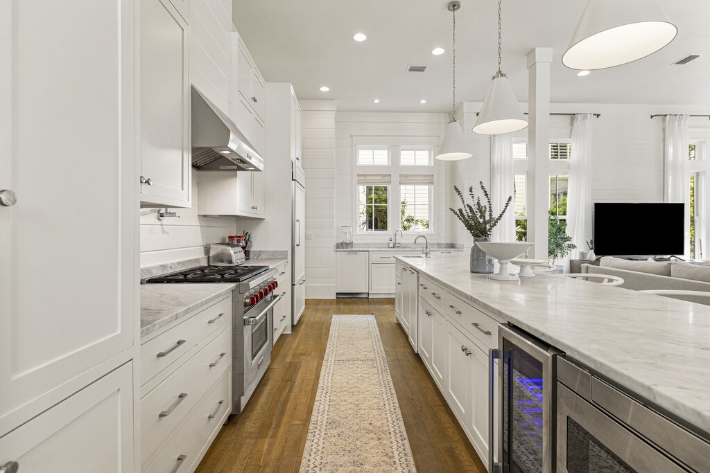 \- Gourmet kitchen featuring stainless steel appliances, wine refrigerator,