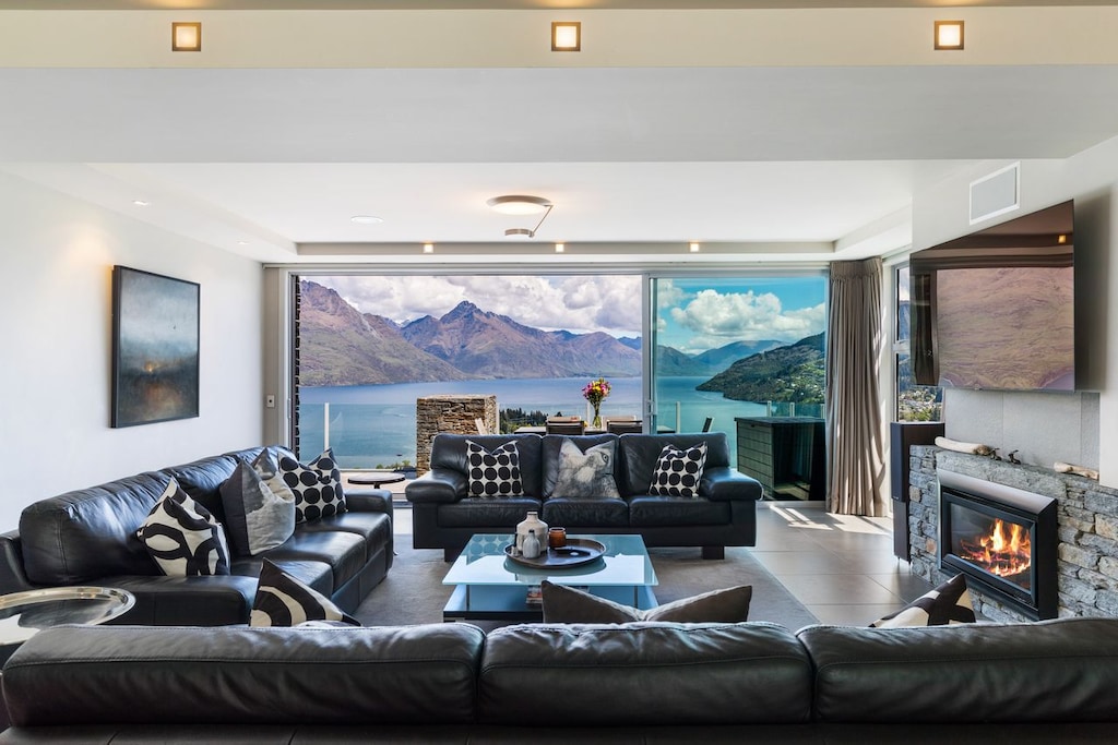 Expansive floor-to-ceiling windows provide uninterrupted vistas of Lake Wakatipu and the majestic surrounding mountains, while the open-plan design delivers a spacious and inviting atmosphere, which is perfect for families or groups of friends to unwind in style.
