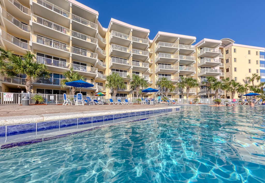 Destin West Beach and Bay Resort provides travelers access to both the bay and beach with all the amenities in between. Featuring Gulf-front units and Bayside units, the hardest decision is deciding whether you want a view of the Gulf of Mexico or the Choctawhatchee Bay. This resort offers a variety of amenities of the Gulf side including a 5,000-square-foot lagoon-style pool, a kiddie pool, hot tub, fitness center and barbecue grills. On the Bay side, you will find even more fantastic amenities consisting of a 700 foot lazy river, two over-sized hot tubs, and additional barbecue grills, all featuring gorgeous views of the Bay. Access the pristine Gulf beach via the skywalk. Limited covered parking is available on both sides.