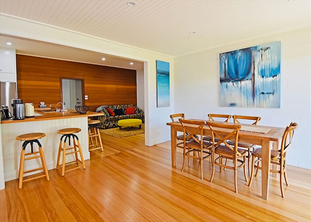 This fully renovated cottage style beach house is nestled within peaceful surrounds and generous open lawn space. Offering 3 bedrooms, two with king beds–option to split king beds each into two singles if sufficient notice is given–and third bedroom with a queen bed; 2 bathrooms, each with shower, vanity and toilet–main with bath–a European style laundry with washing machine, dryer and open parking for 3 cars.