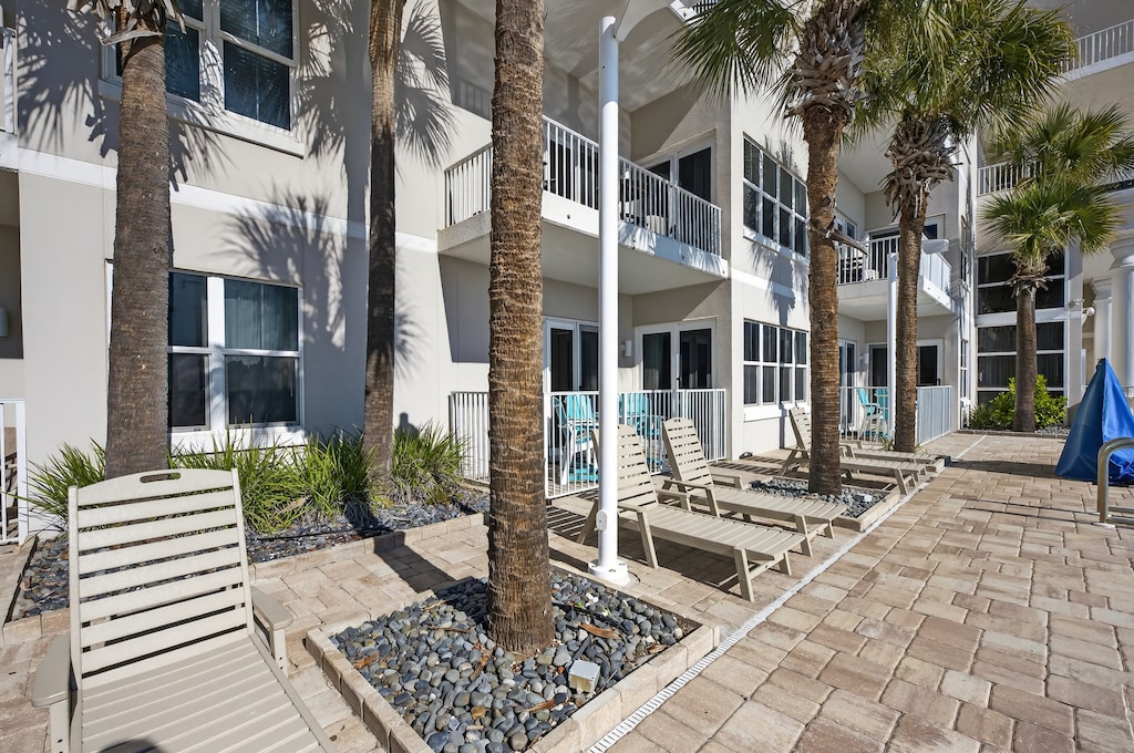 Step outside onto your furnished patio, which opens directly onto the pool deck and offers limited Gulf views. Accessible from both the living room and master bedroom, this outdoor space is perfect for morning coffee or evening relaxation. Your stay includes one seasonal beach service setup, with an umbrella and two chairs reserved just for you, ensuring your spot on the sand is always ready. The first-floor location and easy access to the pool deck make this unit especially convenient for families or anyone who loves being close to the water.