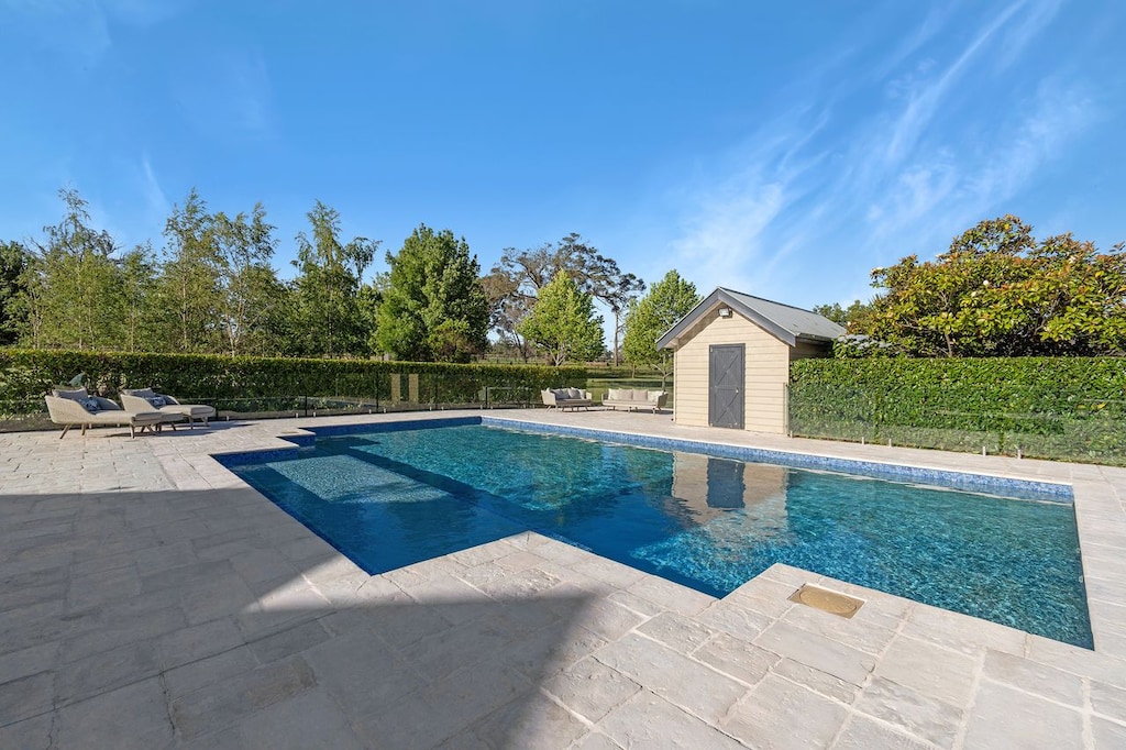Through the French doors from the living area is a beautiful terrace with outdoor dining table and large retractable awning, allowing guests to enjoy the fresh country air in all weather. The pool area is adjacent to the house and terrace.