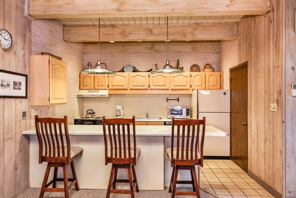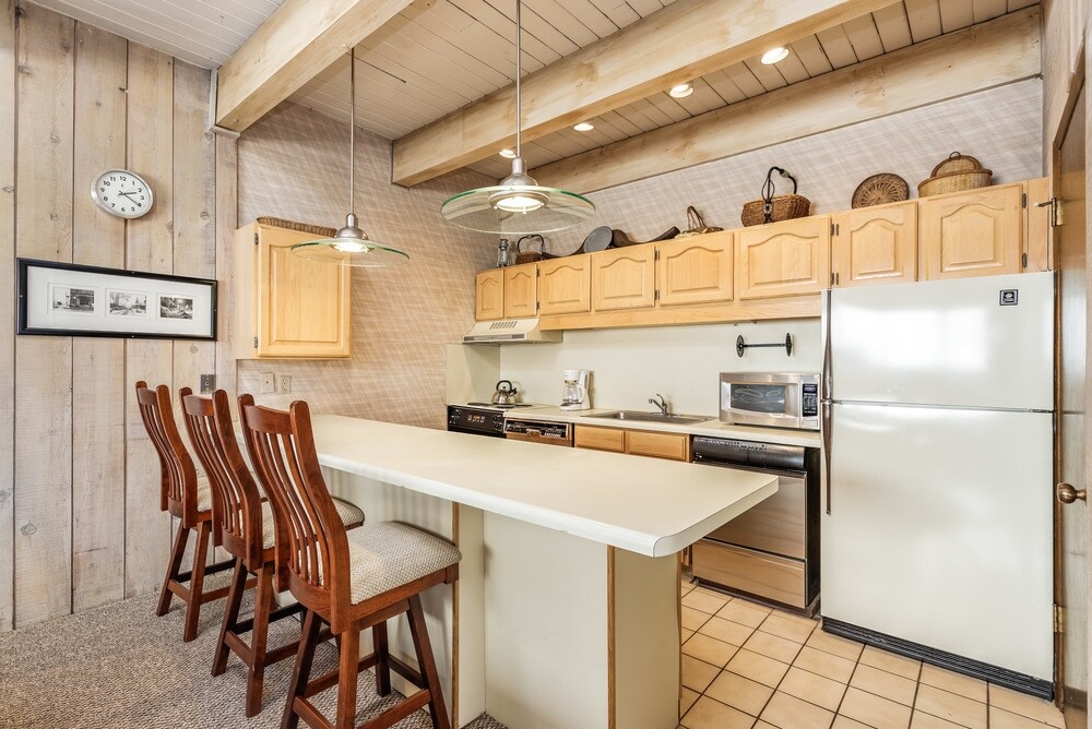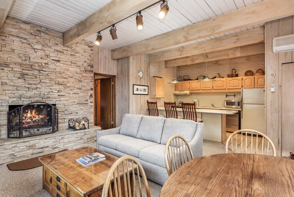 This top floor 2-bedroom, 2-bathroom condominium spans 1,000 square feet, offers great natural light, and features a wood-burning fireplace. Chateau Dumont is located in downtown Aspen, only one block from the Silver Queen Gondola. Condo amenities include a balcony overlooking the complex courtyard with views of Aspen Mountain, a dishwasher, a laundry closet, a breakfast bar, a formal dining area, and flat screen TVs. There is a wall-mounted air conditioning unit in the living room.