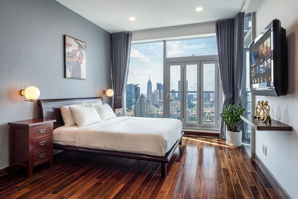 The 180 sqm apartment plus balcony is spacious and perfect for friends, couples, families and business guests. There are four bedrooms, of which one has en-suite bathroom, a home gym and wellness room, a large living room and dining space overlooking the city of Saigon.