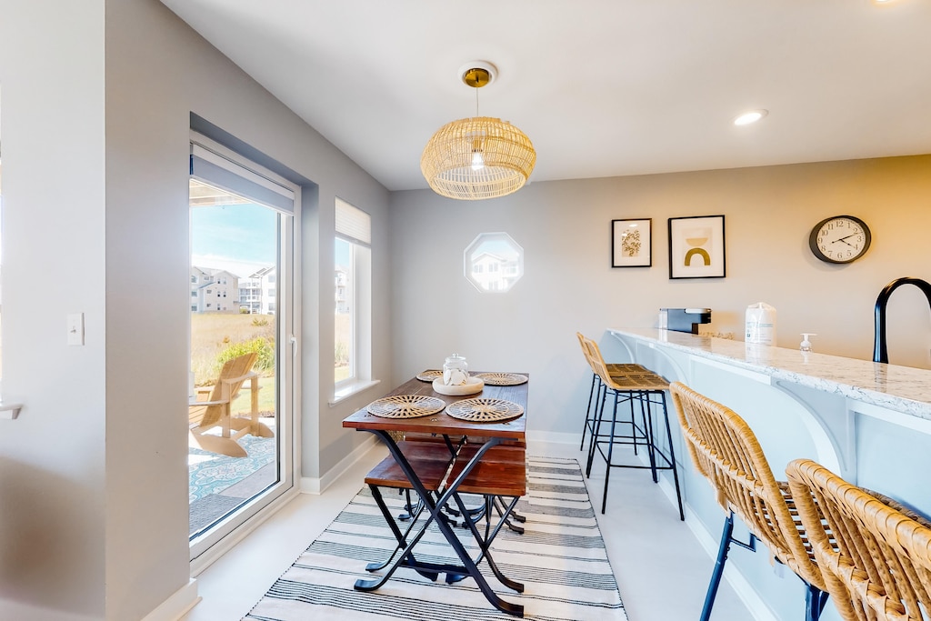 Full of sunlight and easy elegance, this condo offers a peaceful and scenic respite after a day spent surfing, clamming, or beachcombing. Choose a record to play on the turntable, kick back on the sofa with a view of the dunes, or stream a favorite movie on the living room’s smart TV.