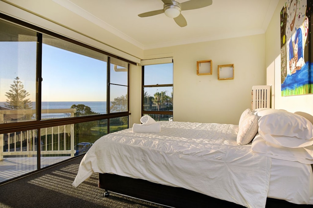 Mornings here begin with the sound of waves. From the upstairs bedrooms, you can watch the sun rising over the Pacific before stepping out to the balcony with a cup of coffee in hand. A short wander across the road leads to Sapphire Beach itself, where you can dive in for a swim, paddle out with a surfboard, or simply stroll along the shore.
